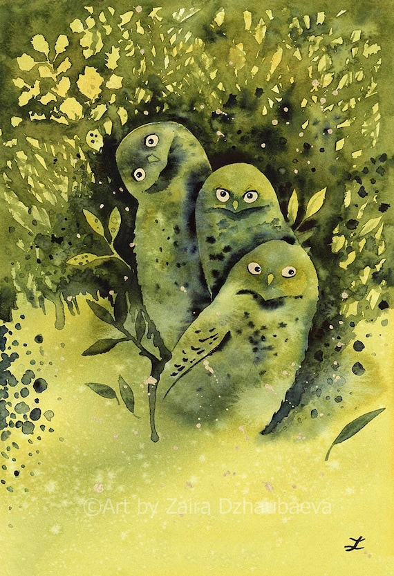 Owls On Tree 13 X 19 Wall Art Print Owl Watercolor Green Etsy Uk